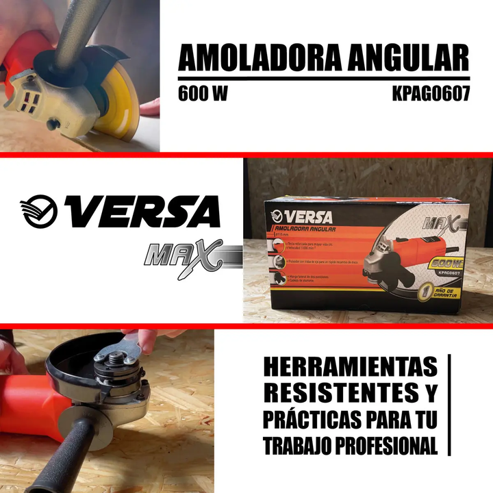 AMOLADORA ANGULAR ELECTRICA 115MM VERSA KPAG0607 600W 11.000 Amoladora Angular Versa 600 W – Precisión y control en cada pasada Diseñada para tareas de corte, desbaste y terminación, esta amoladora combina tamaño compacto con un rendimiento estable para trabajos domésticos y de mantenimiento. • Pote...