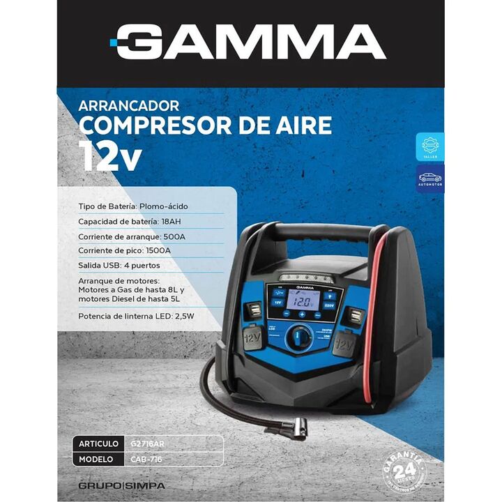 Arrancador y Compresor de Aire Gamma G2716AR 12V: ¡Tu Aliado Infalible en la Ruta y el Hogar! ¿Cansado de quedarte varado por una batería descargada o un neumático desinflado? El Arrancador y Compresor de Aire Gamma G2716AR (modelo CAB-716) es la herramienta multiusos que te sacará de cualquier apur...