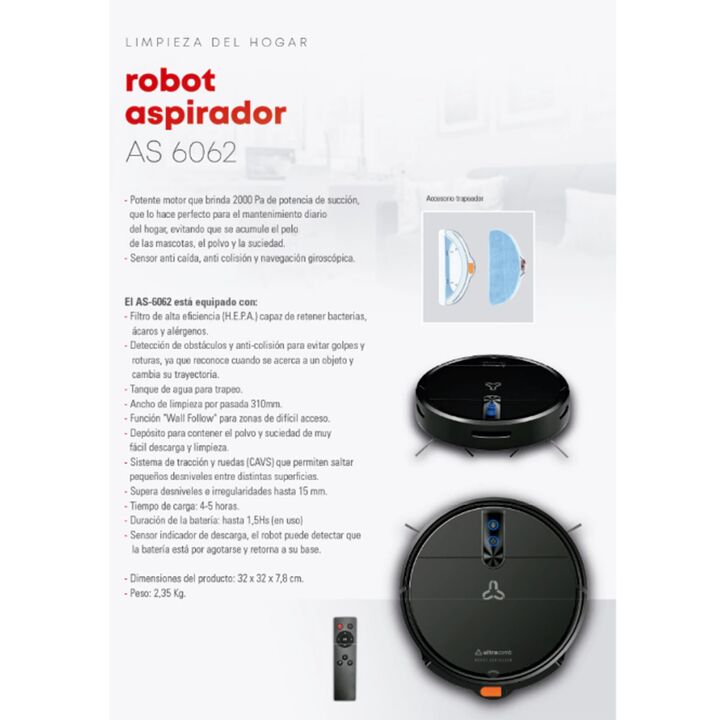 Descubrí la Aspiradora Robot AS-6062, el aliado inteligente que transforma la limpieza diaria en una experiencia simple, eficiente y automática. Ideada para quienes desean mantener sus ambientes impecables sin esfuerzo, esta aspiradora robot combina innovación y practicidad, adaptándose a todos los ...