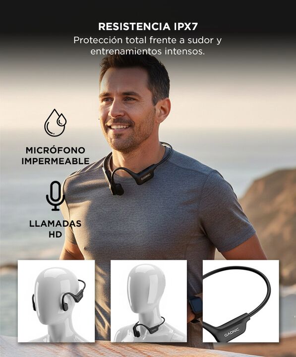Tecnología Open-Ear con conducción ósea: Los auriculares GADNIC transmiten el sonido mediante vibración ósea, dejando el canal auditivo libre. Ideales para entrenar manteniendo percepción del entorno y mayor seguridad al correr o pedalear. Resistencia IPX7 para entrenamientos intensos: Certificación...