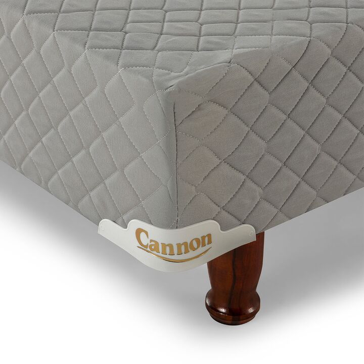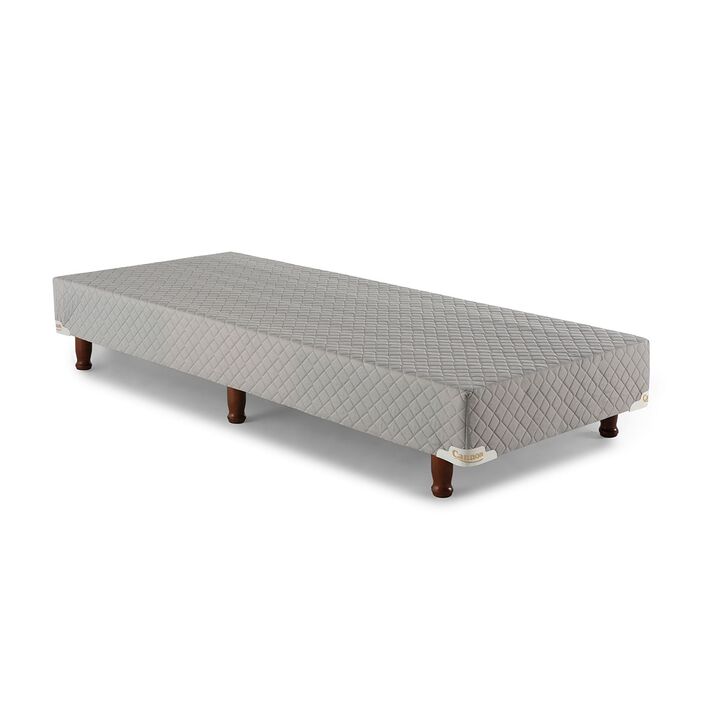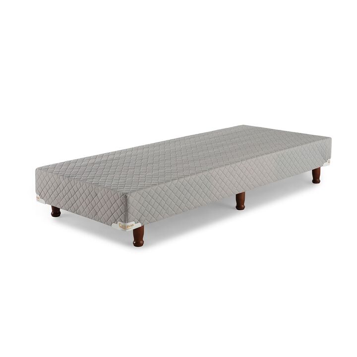 Sommier base de madera estacionada cubierta con espuma de alta densidad. Tapizado en tela de Algodón Polyester, totalmente matelaseados. Patas de madera torneadas y laqueadas.