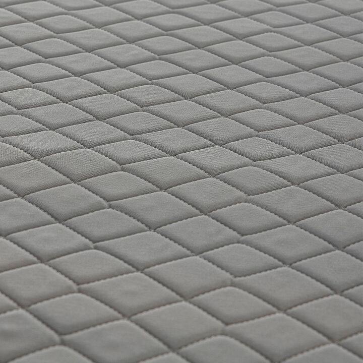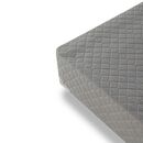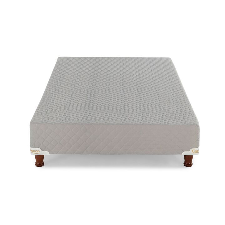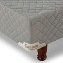 Sommier base de madera estacionada cubierta con espuma de alta densidad. Tapizado en tela de Algodón Polyester, totalmente matelaseados. Patas de madera torneadas y laqueadas.