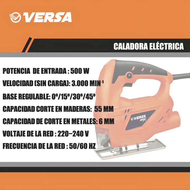 CALADORA ELÉCTRICA VERSA KSTJS0500 500W 3000RPM CORTE MADERA METAL 0-45° • Realiza cortes precisos, especialmente en curvas cerradas. • Fácil de manipular. • Material muy resistente. • Capaz de trabajar en varios materiales sin dificultades. • Con una potencia de 500 W, esta sierra es ideal para pro...