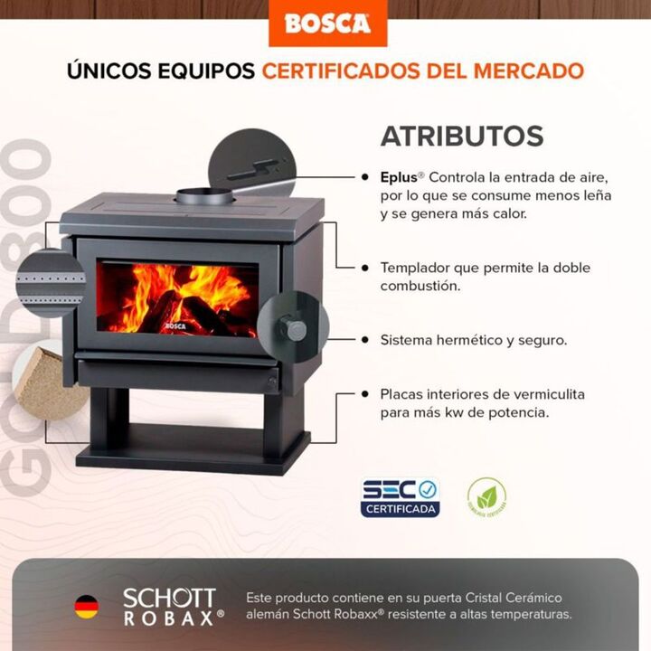 Salamandra Bosca Gold 800 Charcoal Estufa Leña 280m2 11200Kc Esta línea se caracteriza por el diseño tradicional, la incorporación de color y los detalles. Para aquellos que disfrutan de la elegancia en cada momento de la vida. RECOMENDACIONES PARA EL USO DE LA LEÑA Para un buen manejo de su calefac...