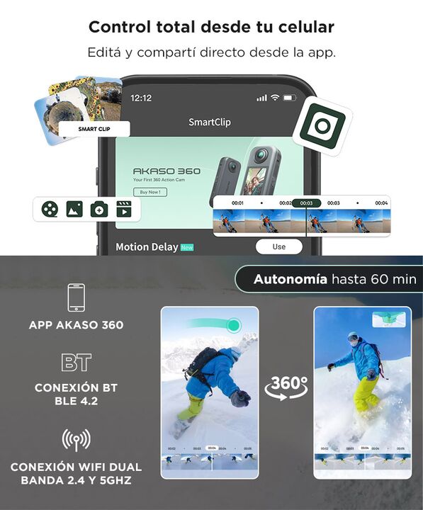 Video 360° en resolución 5.7K real: La Cámara de Acción AKASO 360 captura imágenes envolventes con máxima definición y nitidez. Ideal para deportes, viajes y contenido inmersivo profesional. Estabilización avanzada Horizon Steady: Mantiene el horizonte nivelado incluso en movimientos extremos. Perfe...