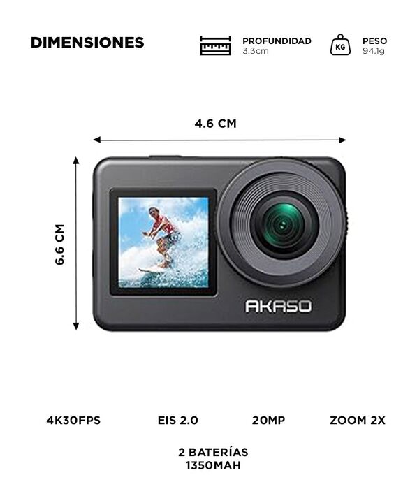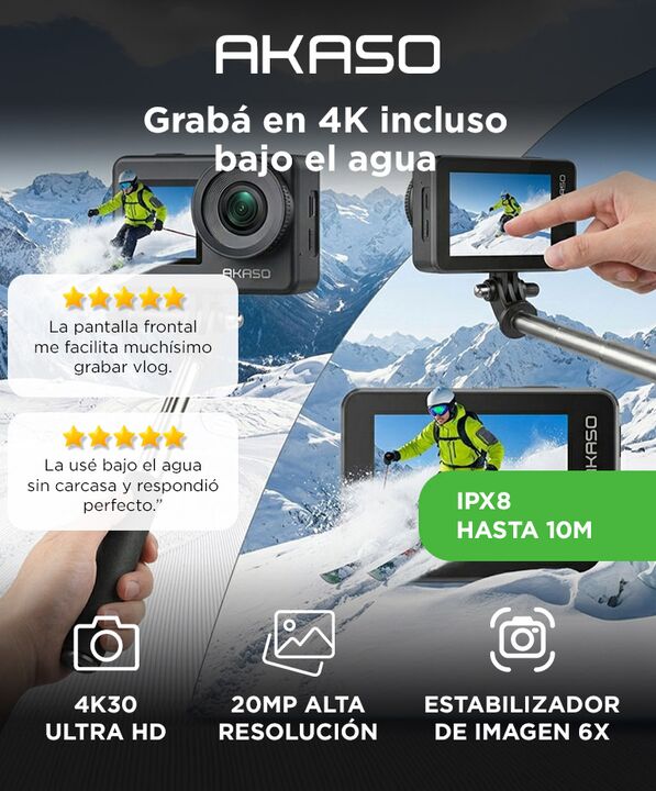 Video 4K30 con estabilización EIS 2.0: La Camara de Accion AKASO Brave 7 graba en 4K30FPS con estabilización electrónica, logrando tomas más fluidas en movimiento, ideal para deportes y aventuras dinámicas. Resistencia al agua IPX8 hasta 10 metros: Permite grabar bajo el agua sin necesidad de carcas...