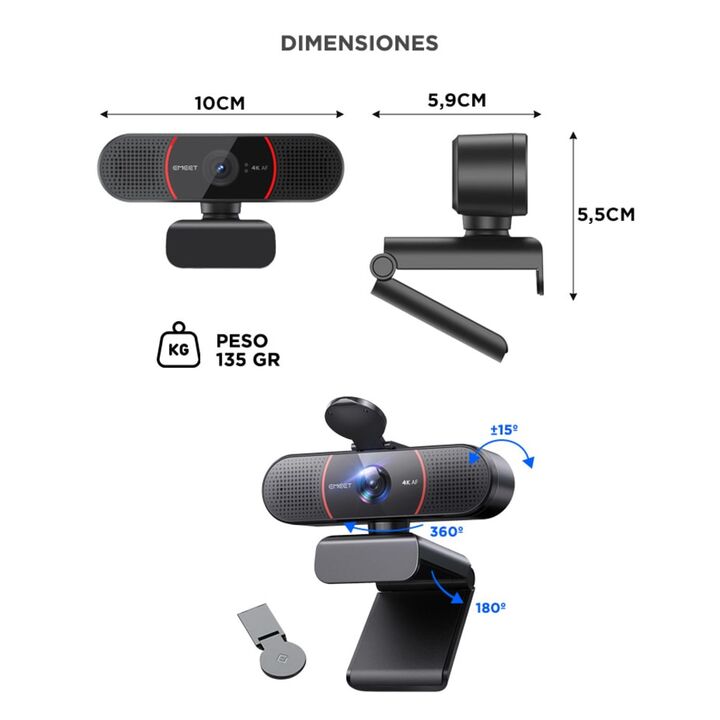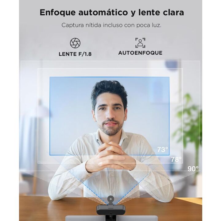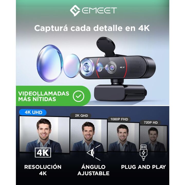 Imagen 4K Ultra HD para videollamadas profesionales Transmití con una calidad sorprendente gracias a la resolución 3840×2160 px. Ideal para reuniones, clases online o contenido en vivo, con detalle y nitidez superiores. Lente de alto rendimiento con enfoque automático El sistema óptico multicapa (5P...