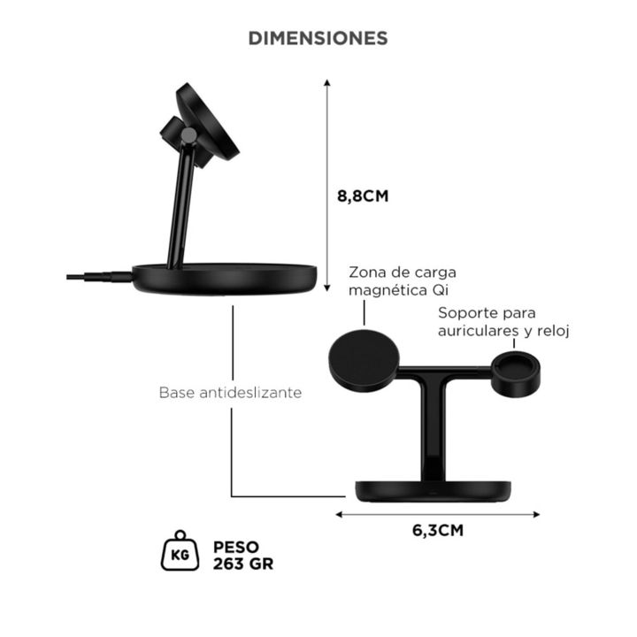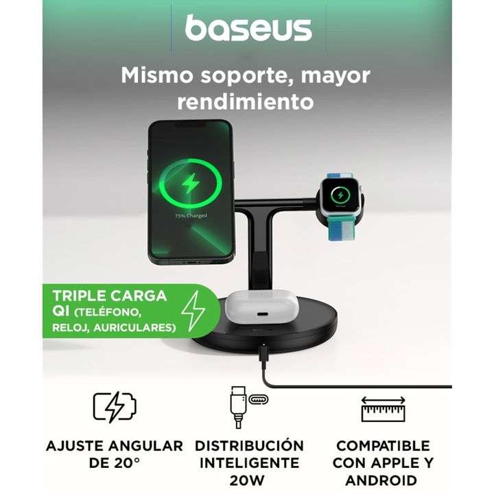Carga 3 en 1 sin enredos Teléfono, reloj inteligente y auriculares en un solo soporte. Organizá tu espacio de carga. Potencia total de 20W Distribución inteligente de energía para cargar todo con eficiencia y sin sobrecalentamientos. Ajuste de inclinación de 20° Elegí el ángulo más cómodo para segui...