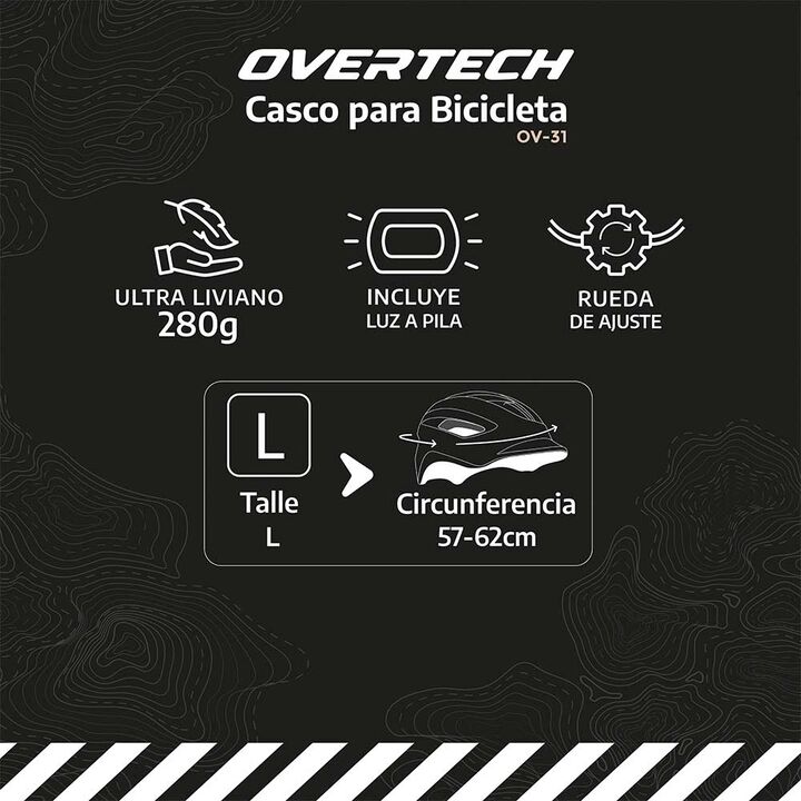 Casco Bicicleta Overtech OV-31N MTB con Luz LED El Overtech OV-31N combina diseño aerodinámico con funcionalidad completa. Carcasa PC+EPS de 280g, luz trasera LED a pila para visibilidad en cualquier condición y regulador de ajuste. Su perfil más cerrado lo hace ideal para quienes buscan un casco co...