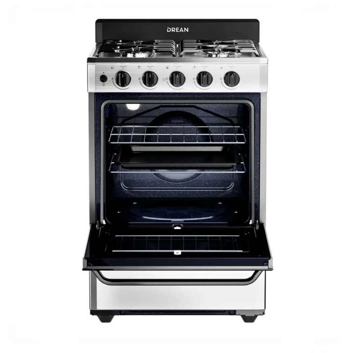 La cocina Drean CD5603AIO de 56 cm en acero inoxidable combina eficiencia, seguridad y diseno moderno. Equipada con cuatro hornallas Fast Cook multitamanos de fundicion con diseno curvo Avant y sensor de flama, ofrece un calentamiento hasta un 30% mas rapido, optimizando el consumo de gas. Su horno...