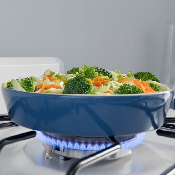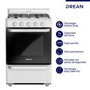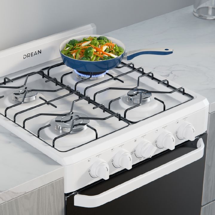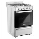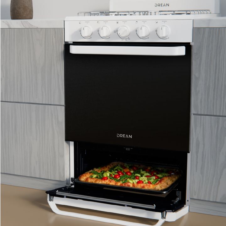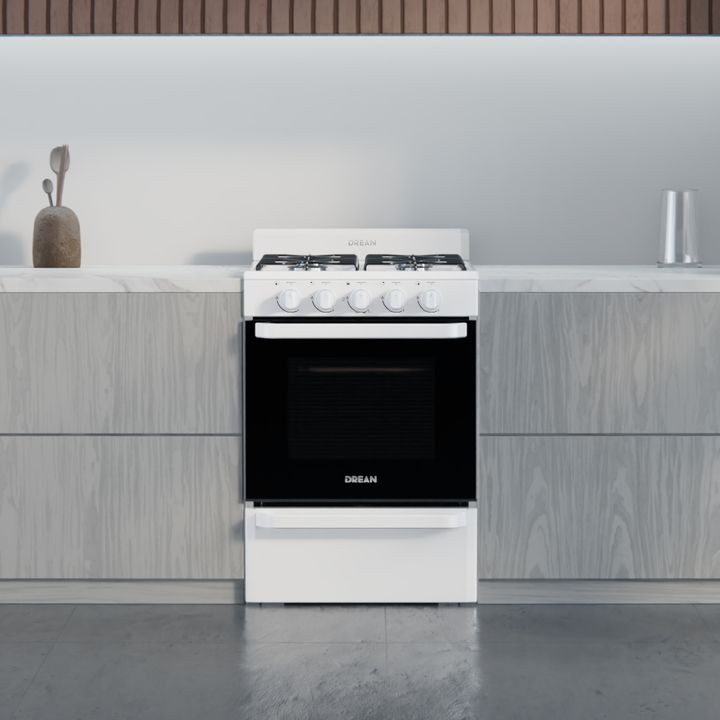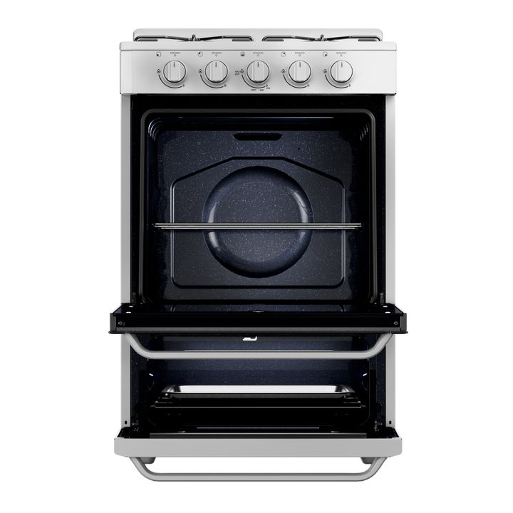 Cocina multigas de 56 cm. Color Blanco. Puerta de horno con vidrio panorámico. Capacidad del horno: 74 litros. Cajón parrilla con puerta abatible. 2 parrillas superiores de alambrón. Válvula de seguridad. Encendido manual en horno y hornallas. Termocontrol en horno. Control frontal. Perillas plástic...
