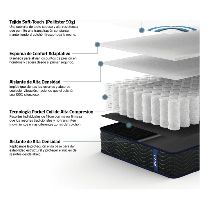 El FIKA Pocket es la evolución del colchón tradicional. Su sistema de resortes Pocket (encapsulados) ofrece un soporte de alta precisión: se adapta a los puntos de presión de tu cuerpo y garantiza una independenci...