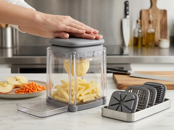 CORTADOR DE PAPAS ATMA HOME 4 CUCHILLAS AACP103P El Cortador de Papas Atma Home con 4 cuchillas es una herramienta práctica y eficiente para cortar papas y vegetales de manera rápida y uniforme. Su diseño permite obtener distintos tipos de cortes con facilidad, ideal para uso doméstico. Característi...