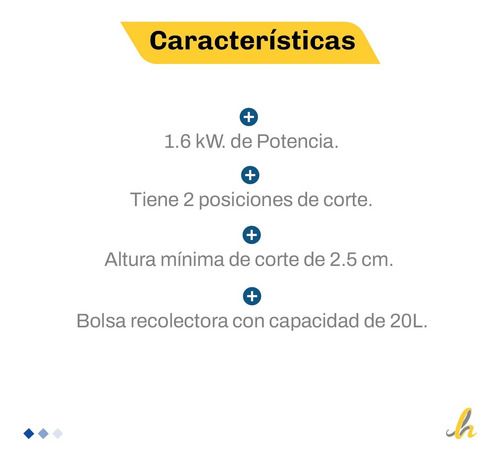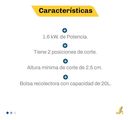 Modelo: R45SR Marca: BESTRON Garantía: 12 meses CARACTERÍSTICAS: - Potencia: 1.6 kW. - Voltaje: 220V. - Tiene 2 posiciones de corte. - Ancho de corte: 39cm. - Altura mínima de corte: 2.5 cm. - Capacidad de la bolsa recolectora: 20L. - Peso: 15 kg. - Llave interruptora con doble comando de corte eléc...
