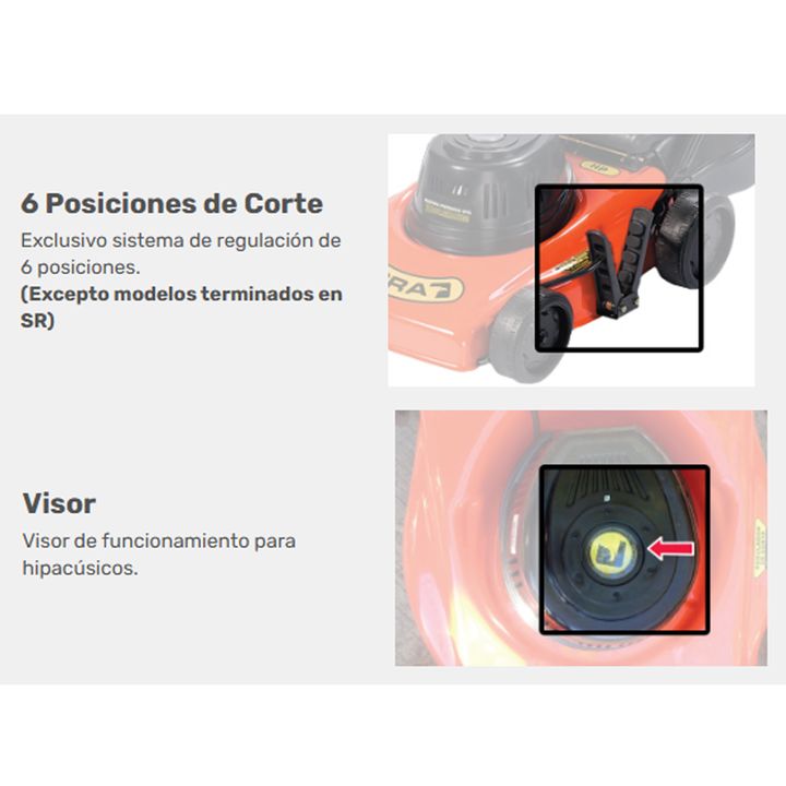 Exclusivo sistema de regulación de 6 posiciones. Visor de funcionamiento para hipacúsicos. Tipo: Con Canasto Rígido (20 Litros) Potencia: 1 HP Potencia maxima util: 1600 Watts Ancho x Largo x Alto: 300x505x620 Ancho de carcasa: 390mm Rueda delantera: 110 Rueda trasera: 135 Posiciones de corte: 6 Pos...