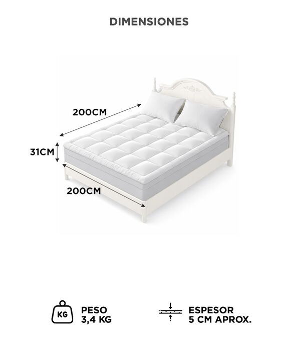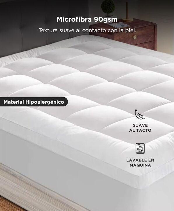 CONFORT EXTRA TAMAÑO KING Este cubre colchon acolchado tipo pillow top agrega una capa adicional de volumen. Su espesor aproximado de 5cm mejora la sensacion al recostarse. Es ideal para colchones firmes que requieren mayor mullido. Permite renovar la experiencia de descanso de forma simple. RELLENO...