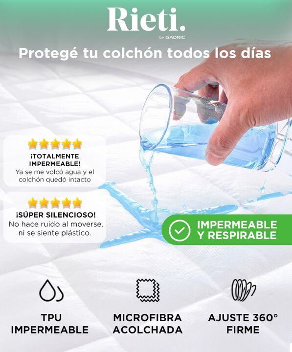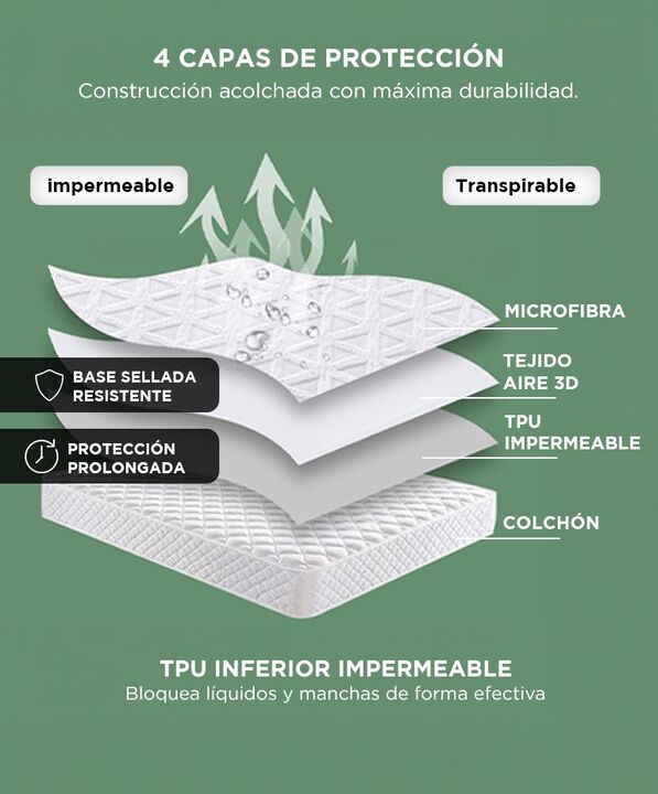 PROTECCION IMPERMEABLE DIARIA Este cubre colchon incorpora un forro inferior impermeable que protege eficazmente frente a derrames y manchas. Actua como barrera que evita que los liquidos alcancen el colchon. Resulta adecuado para uso cotidiano en distintos entornos del hogar. Contribuye a mantener ...
