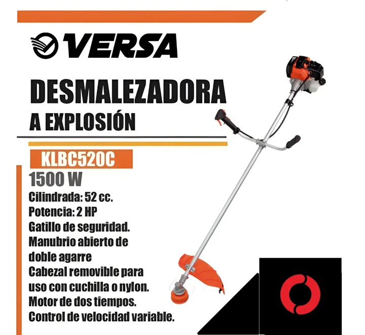 DESMALEZADORA MOTOGUADAÑA EXPLOSION 52CC 2,0HP VERSA KLBC520 Desmalezadora a explosión con motor de dos tiempos de 52 cc, orientada a trabajos de corte y mantenimiento de áreas verdes. Cuenta con manubrio abierto de doble agarre que mejora la estabilidad operativa, y sistema compatible con cuchilla ...