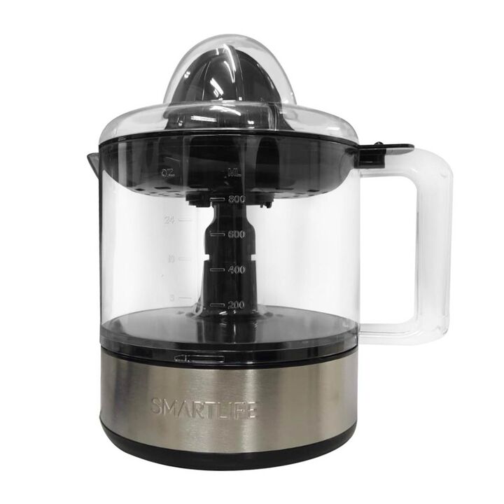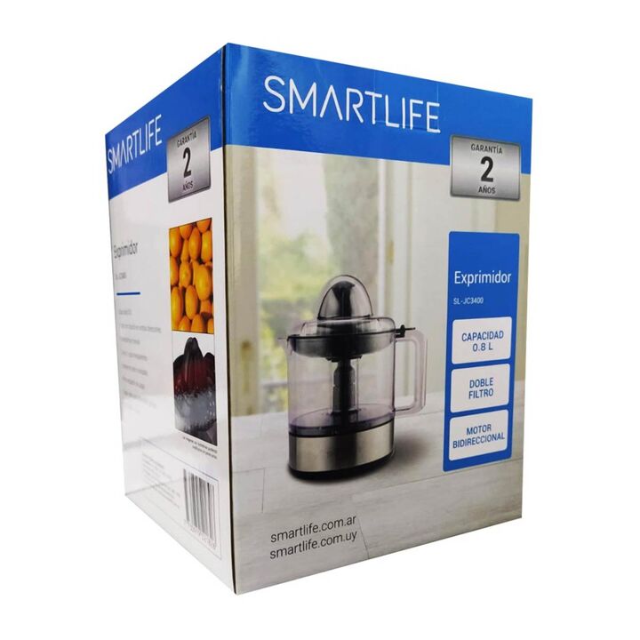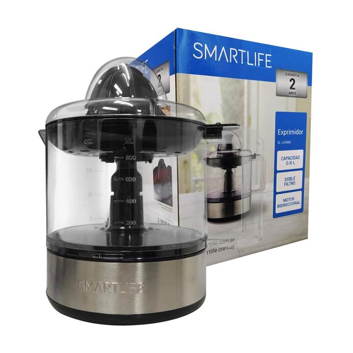 Exprimidor SL-JC3400. Capacidad 1 L. Motor con rotación en ambas direcciones. Encendido por presión. Cuerpo y tapa transparentes. Detalles en acero inoxidable. Filtro regulador de pulpa. Doble cono para diferentes cítricos