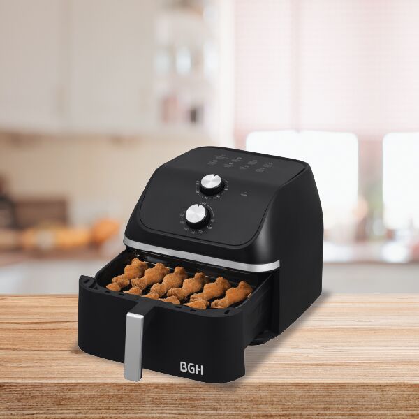 Freidora de Aire BGH 8,5 Litros BAF85MN25 Capacidad extra grande de 8,5 litros ideal para familias. Panel mecánico con guía rápida de 8 menús configurables. Luz interior para controlar la cocción sin abrir el equipo. Rango de temperatura ajustable entre 80 y 200 °C. Potencia de hasta 2260W para cocc...