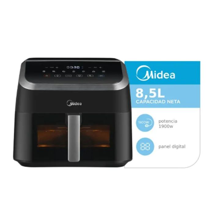 Capacidad: 8.5 litros. Potencia: 1900 Watts. WideMax: Con mayor capacidad que las freidoras de aire convencionales. Función Flexi-Heating: Permite precalentar la freidora con un solo toque y adicionar el tiempo que quieras. Control digital. Ventana transparente. Luz interior. Cesto removible de mate...