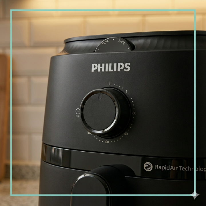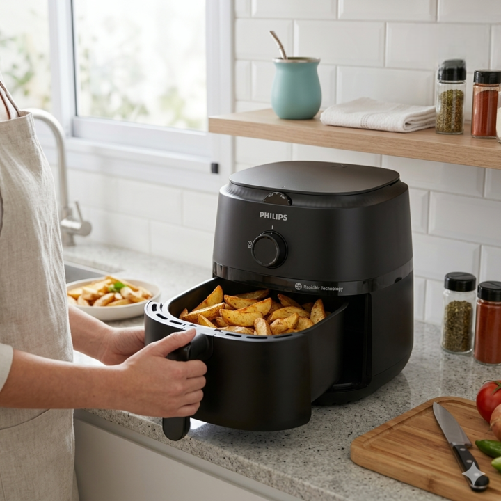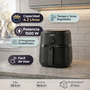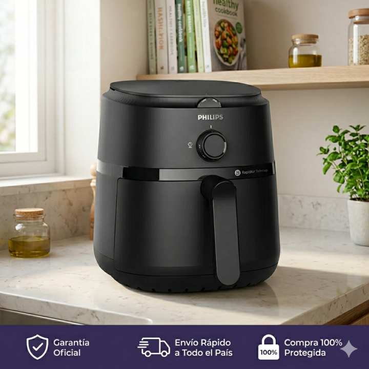 Marca: Philips || Línea: Serie 1000 || Modelo: NA120/00 || Capacidad: 4,2 L || Capacidad en peso: 500 g o 6 muslos de pollo || Potencia: 1500 W || Tecnología Rapid Air || 12 funciones || Control análogo con perillas || Temperatura máxima: 200 °C || Temporizador: Sí || Apagado automático: Sí || Mango...
