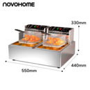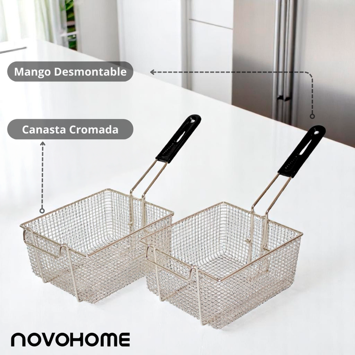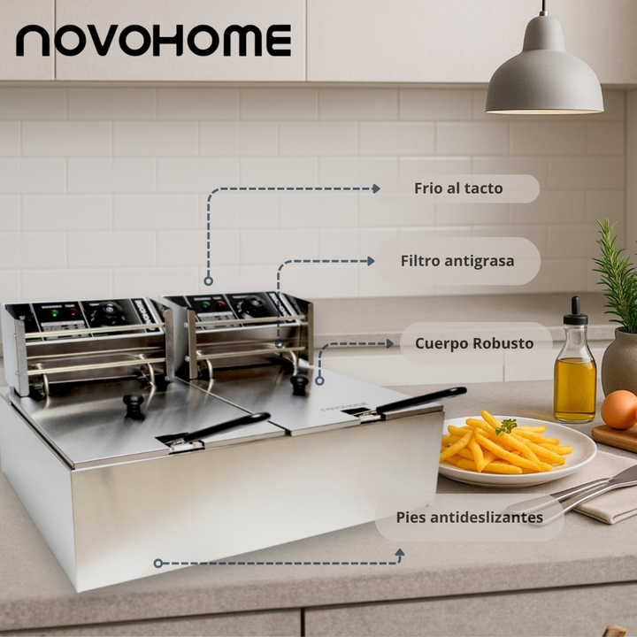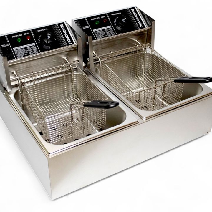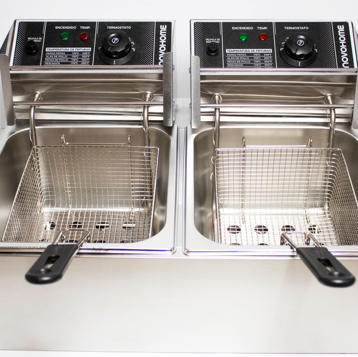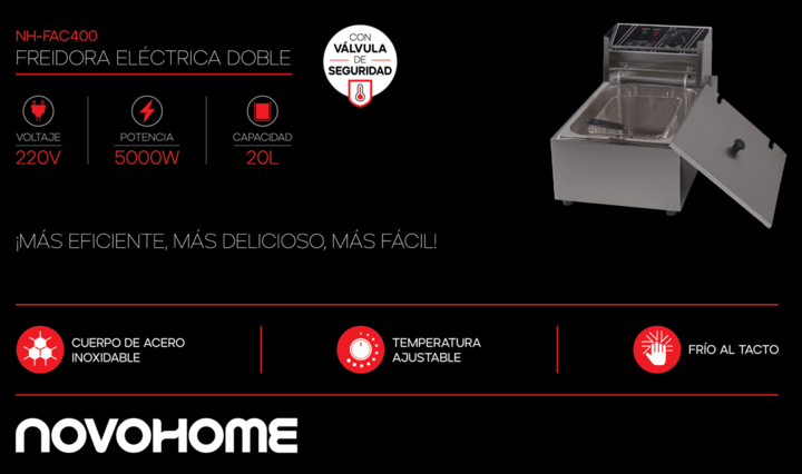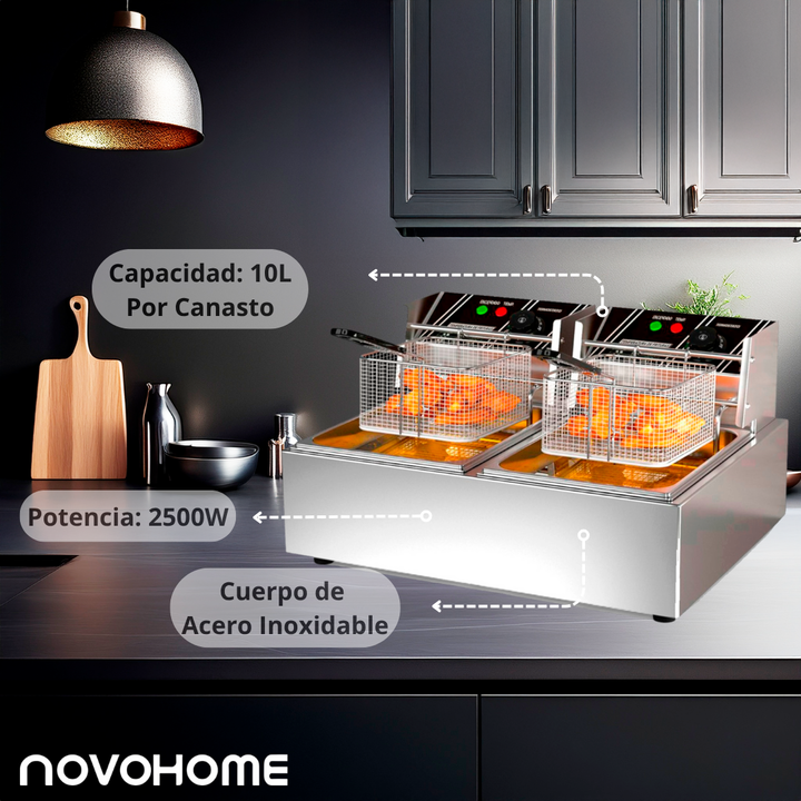 NOVOHOME FREIDORA DE ACEITE 20 LTS DOBLE CANASTO - 5000W SKU: NH-FAC400 ¡MÁS EFICIENTE, MÁS DELICIOSO, MÁS FÁCIL! La freidora eléctrica de doble canasto Novohome está diseñada para maximizar la productividad en cocinas profesionales y exigentes. Con una capacidad de 10 litros por canasto y potencia ...