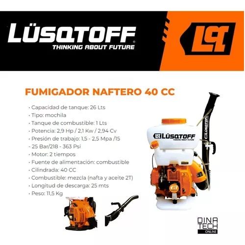 FUMIGADOR NAFTERO LUSQTOFF 26 LTS MOCHILA 40 CC 2T LJ-F40 Liviano, Fácil de operar y transportar. Ideal para casas quintas, Paquizaciones grandes - Capacidad de tanque: 26 Lts - Tipo: mochila - Tanque de combustible: 1 Lts - Potencia: 2,9 Hp / 2,1 Kw / 2,94 Cv - Presión de trabajo: 1,5 - 2,5 Mpa /15...