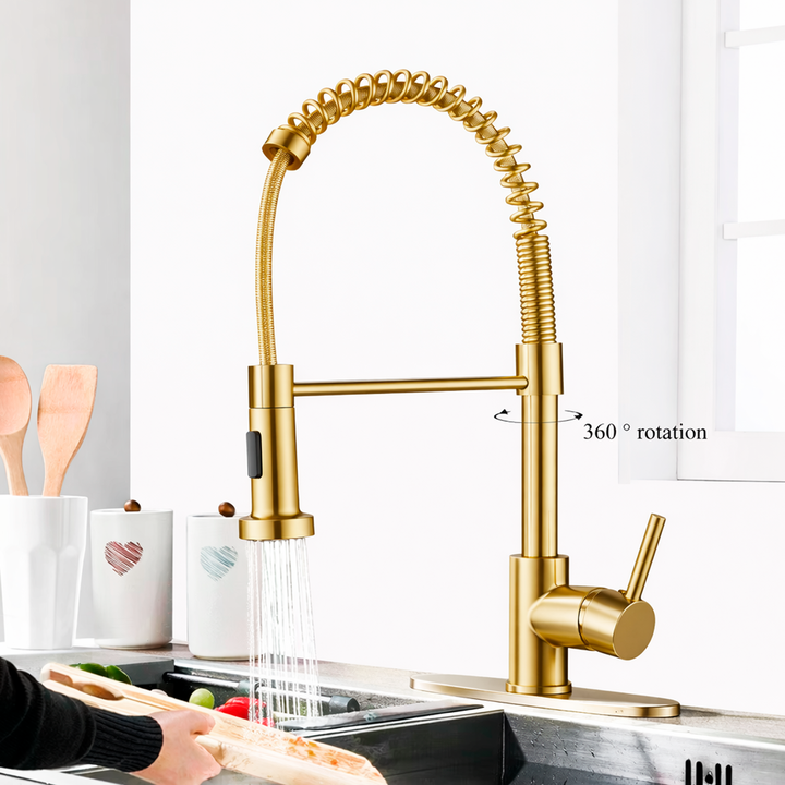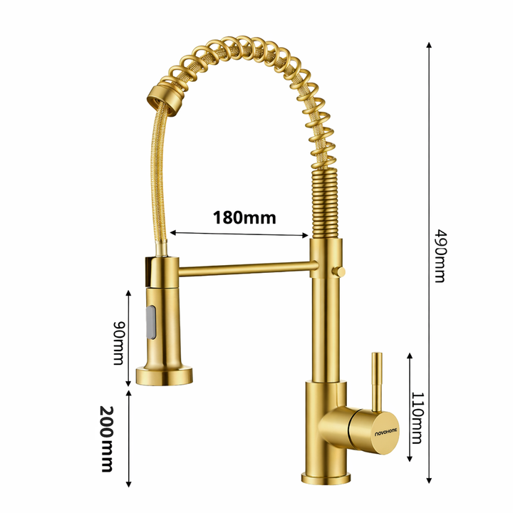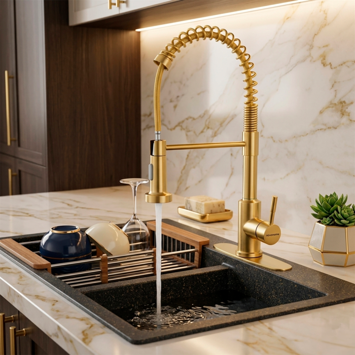 NOVOHOME GRIFERÍA MONOCOMANDO P/COCINA FLEXIBLE GOLD SKU: NH-GC100GL Grifería monocomando de cocina con pico flexible y extraíble, ideal para tareas intensivas de lavado. Diseño tipo industrial con resorte de acero visible, fabricada en materiales de alta resistencia con acabado Dorado. Combina func...