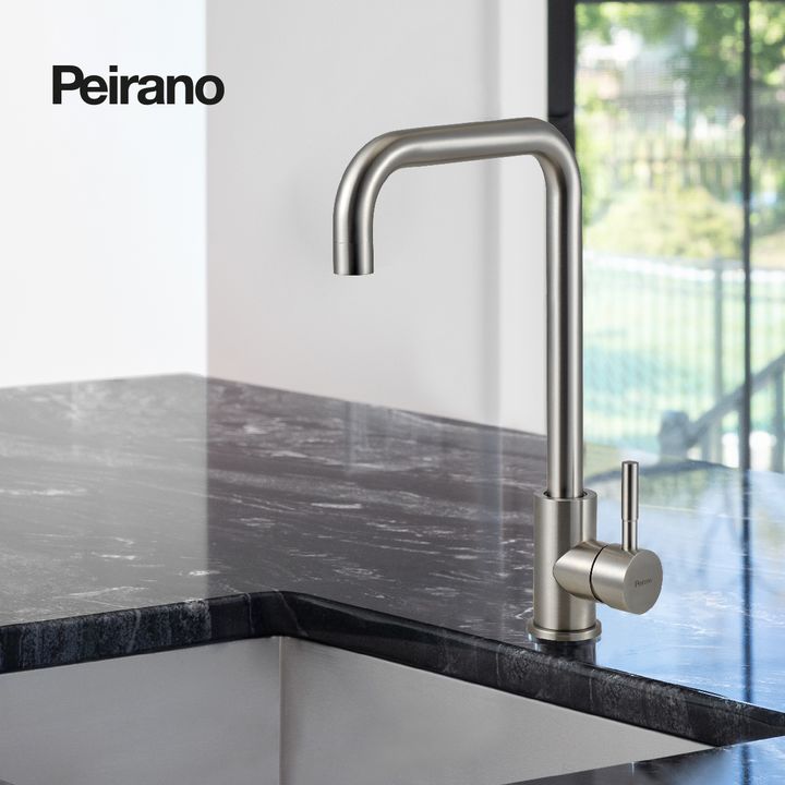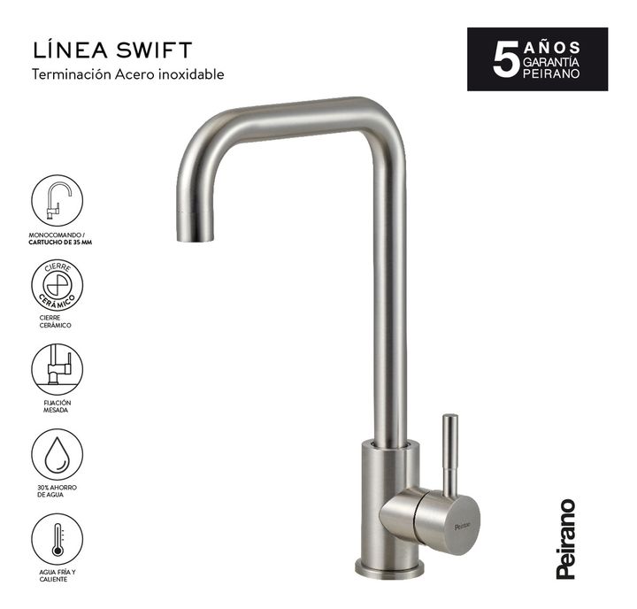 PEIRANO SWIFT MONOCOMANDO P/COCINA SKU: 20-147 CARACTERÍSTICAS - Cierre cerámico - Cuerpo metálico - Terminación en acero inoxidable pulido - Cartucho de 35 mm (gran caudal) - Base del monocomando: Ø 50 mm - 1 bar de presión como mínimo 5 AÑOS DE GARANTÍA CON LA MARCA