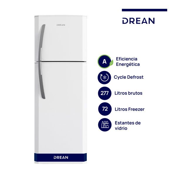 Heladera con freezer cíclica. Eficiencia A. Color blanco. Gas ecológico R600a. Capacidad bruta 277 litros. Capacidad neta 264 litros. Deshielo manual. Estantes de vidrio regulables en altura. Anaqueles en contrapuerta. Cajón especial para frutas y verduras. Luz interior LED. Origen Argentina. Helade...