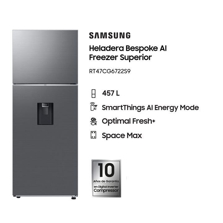 La heladera Samsung RT47CG6722S9B3 en color inox cuenta con una capacidad total de 457 litros y freezer superior, ofreciendo un espacio amplio para la conservación de alimentos. Su sistema No Frost elimina la formación de escarcha y la tecnología de enfriamiento Mono Cooling mantiene la temperatura ...