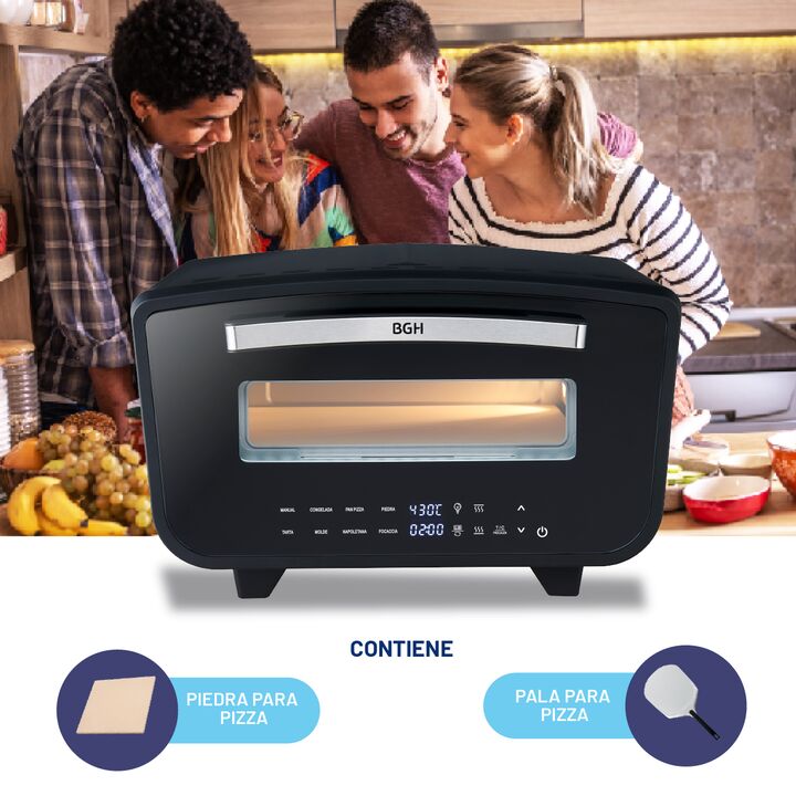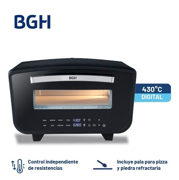 Horno Eléctrico Digital BGH 30 cm BHP12DN25I Potencia profesional y precisión para resultados perfectos Un horno eléctrico diseñado para quienes buscan alto rendimiento y control total en cada preparación. Con temperatura máxima de hasta 430°C, doble resistencia y convección, permite lograr coccione...