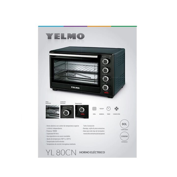 Descripción : El horno eléctrico Yelmo YL-80CN es una opción ideal para quienes necesitan capacidad, potencia y practicidad en la cocina diaria. Con sus 80 litros, permite preparar desde comidas familiares hasta platos más elaborados sin quedarse corto de espacio, mientras que su potencia de 1900W a...