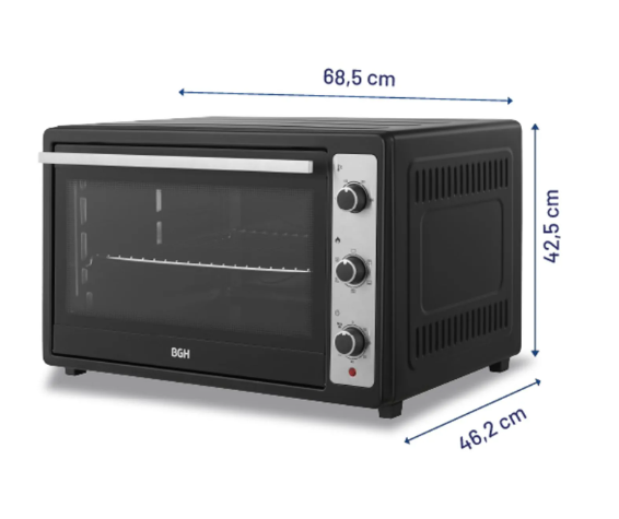 Horno Eléctrico BGH 80 Litros Mecánico Negro BHE80M25I Capacidad de 80 litros ideal para cocinar grandes porciones. Panel mecánico con timer de hasta 60 minutos y función “Stay On”. Función grill y convección para resultados más crocantes y parejos. Luz interior para controlar la cocción sin abrir e...