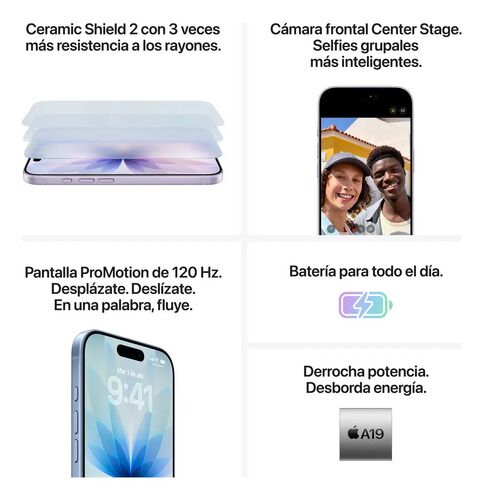 iPhone 17 Apple 6.3 256GB Camara 48MP Ceramic Shield 2 - Black iPhone 17. Aún más sorprendente. Aún más resistente. Pantalla ProMotion de 6.3 pulgadas¹, Ceramic Shield 2, cámaras traseras de 48 MP, cámara frontal Center Stage, chip A19 y más. • AÚN MÁS SORPRENDENTE. AÚN MÁS RESISTENTE. El iPhone 17 ...