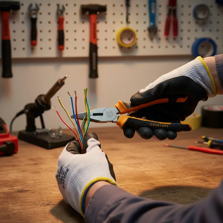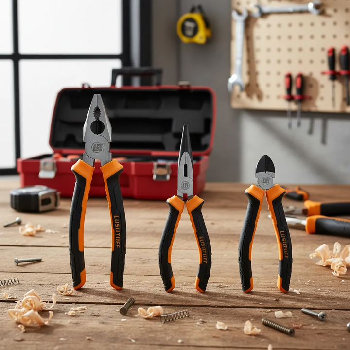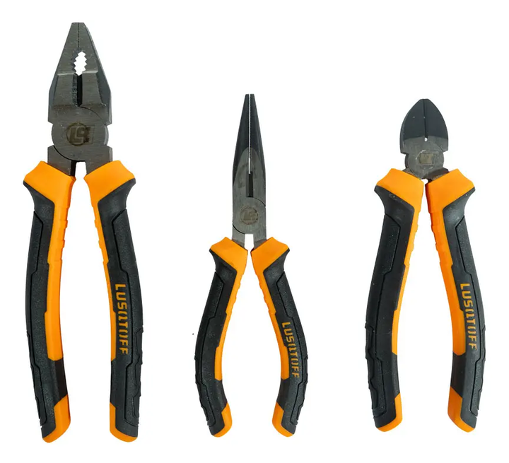 SET JUEGO DE 3 PINZAS UNIVERL ALICAT PUNT LUSQTOFF L4100 • Contiene 3 pinzas: Universal 8 (200 mm.) Alicate de corte diagonal 6 (150 mm.) Punta media caña 6 (150 mm.) • Material acero al carbono 55# • Filo Xtra Sharp HCR-53-60 • Material del cuerpo: HRC-40-48 • Mango comfort grip Garantía 6 meses