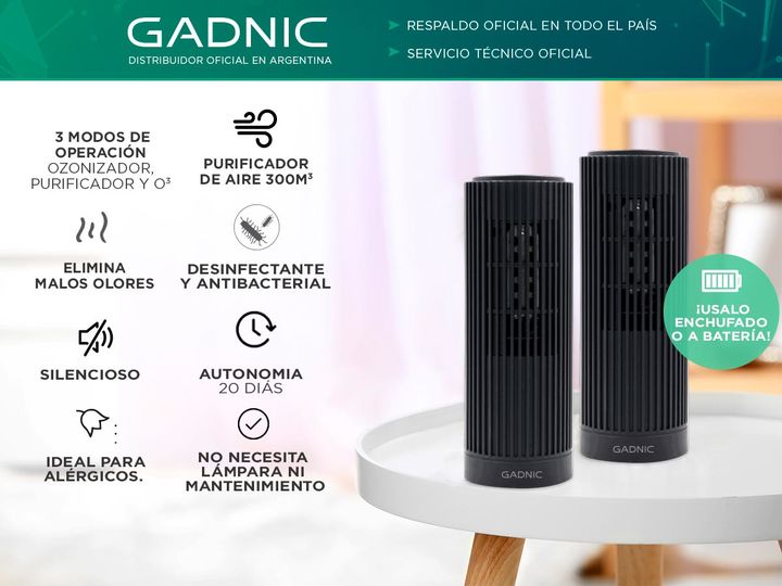 ¡GADNIC presenta su nueva línea de OZONORIZADORES portables y recargables! La mala calidad del aire ingresa a su sistema de respiración y es especialmente dañino para las personas mayores, embarazadas, niños, mascotas y personas con enfermedades alérgicas o respiratorias. Filtra el 99.97% de polvo, ...