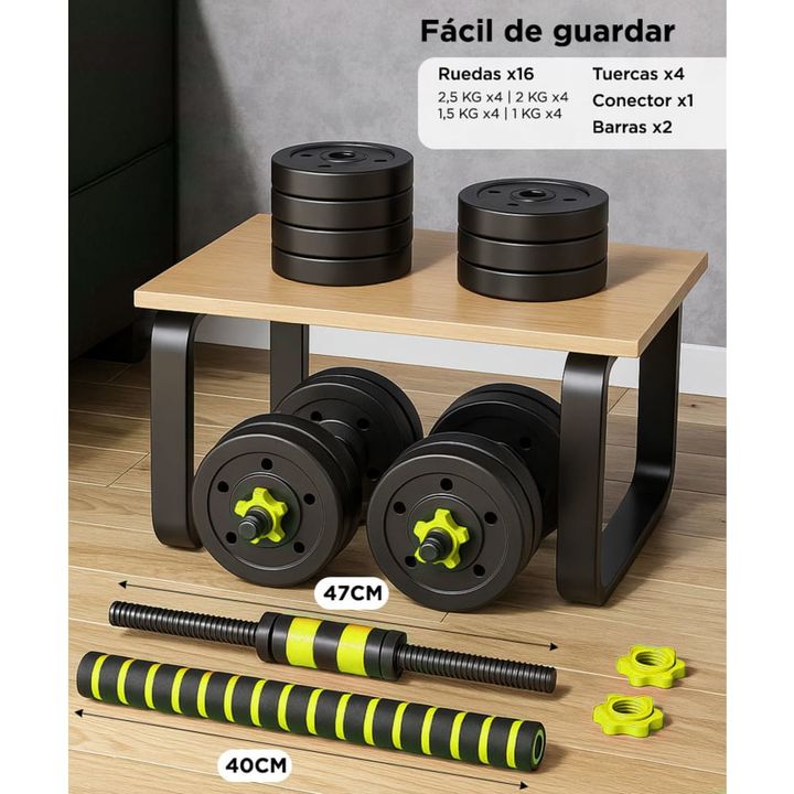 Entrenamiento completo en casa: incluye barra y mancuernas regulables para ejercitar todo el cuerpo. Hasta 30 kg ajustables: combiná discos de PVC intercambiables para lograr la carga ideal. Diseño seguro y confiable: topes a rosca firmes que evitan movimientos de los discos durante el uso. Mayor co...