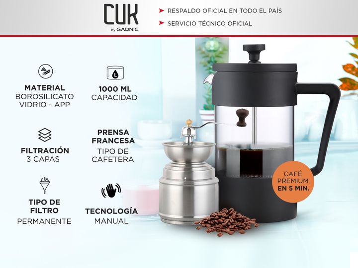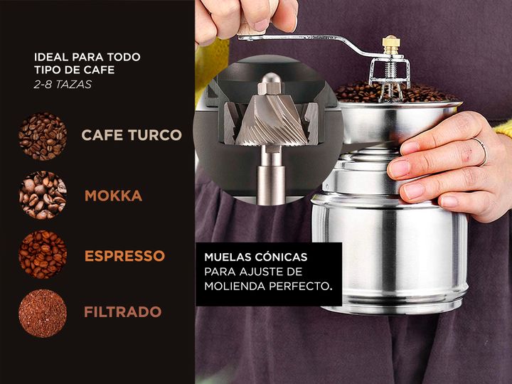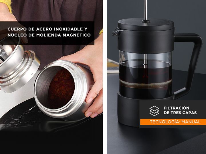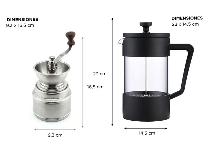 Especificaciones Molinillo de Cafe Manual Gadnic - GRINDER2 Dimensiones: 16.5 x 9.5 cm Capacidad: 2-8 Tazas Peso: 382 g Material: Acero inoxidable ------------------------------------------------------------------------------------------- Cafetera Manual Prensa Francesa Gadnic - CAFETE02 Material: B...