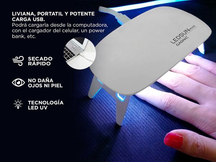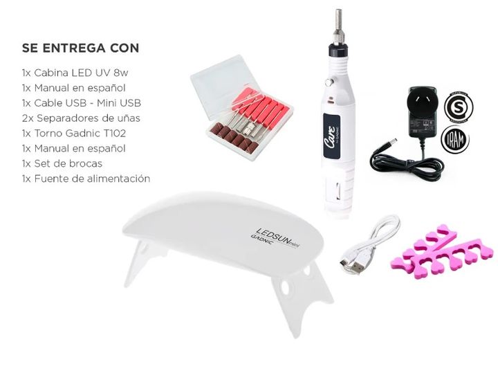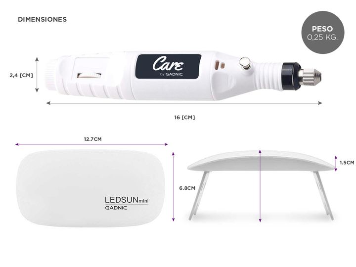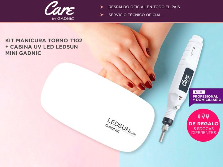¡GADNIC presenta su nueva línea de KITS para manicura profesional! LEDSUN Mini es una increíble cabina UV LED 8w para uñas gelificadas/esculpidas de uso domiciliario y portatil. La luz funciona tanto para esmaltes de gel, permanentes y semi-permanentes. Ajuste de velocidad hasta 25,000 RPM. Ideal pa...