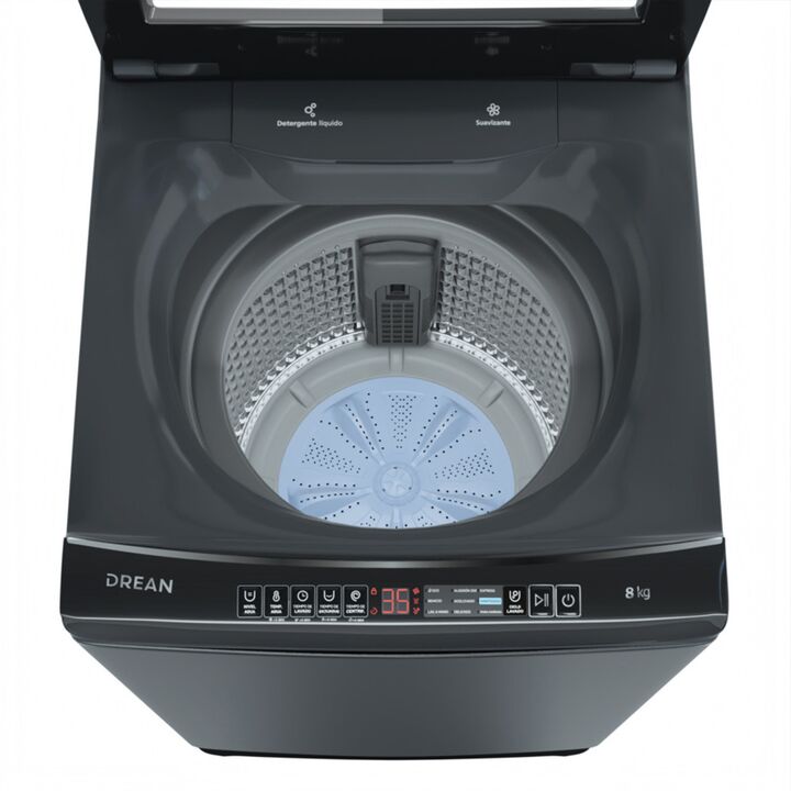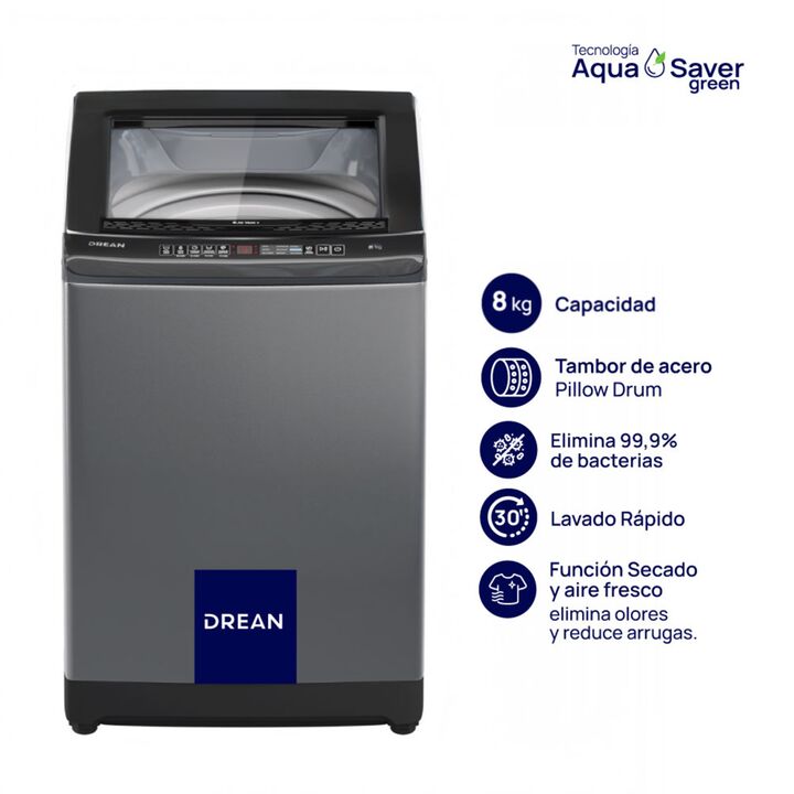 Lavarropas de carga superior. Su capacidad de lavado es de 8 Kg y su velocidad de centrifugado regulable hasta 660 RPM. Color gris. Eficiencia C. Sistema de lavado oriental. 9 programas de lavado entre ellos: ECO, Express y Acolchado. Display LED. ID System con ajuste de agua inteligente. Inicio dif...