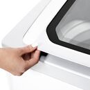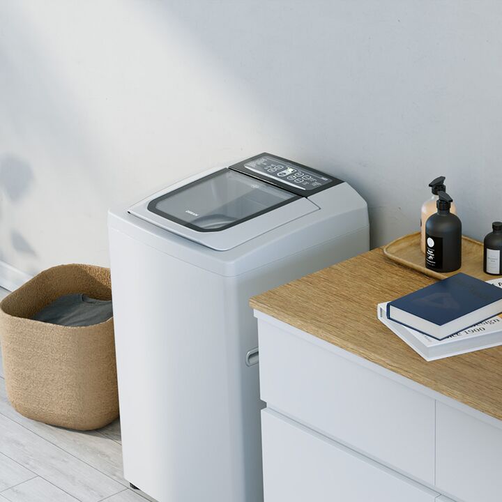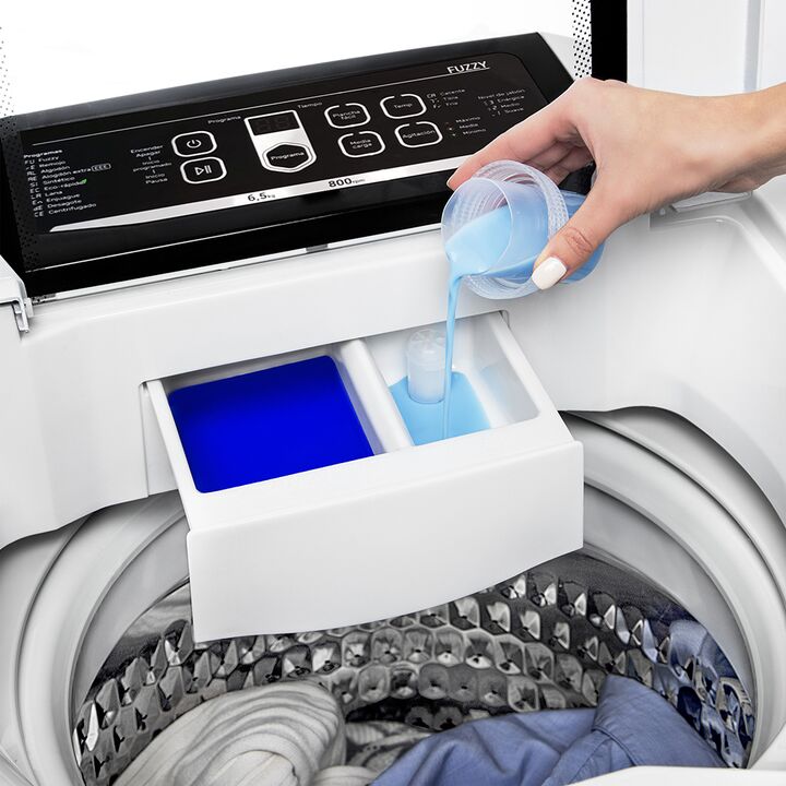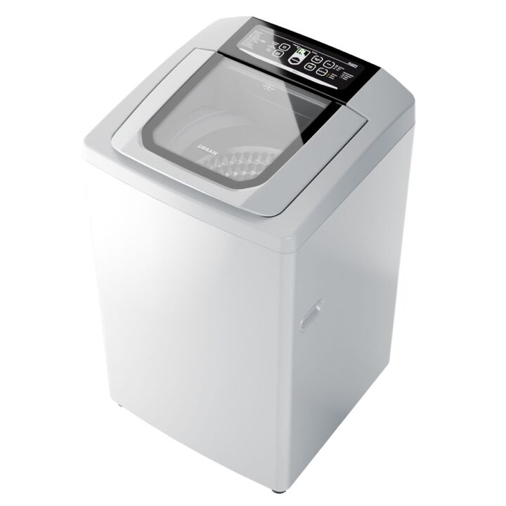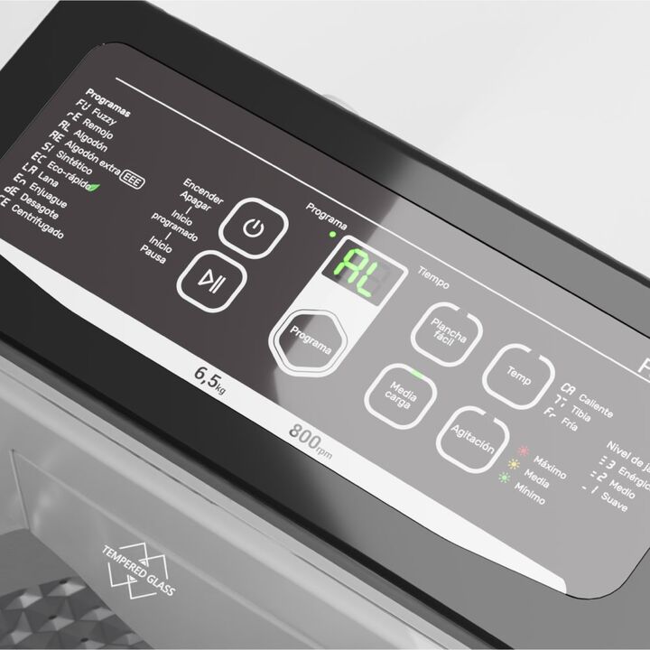 Lavarropas automático de carga superior. Capacidad de 6,5 Kg. Color blanco. Velocidad de 800 RPM. Eficiencia A+. Sistema de lavado oriental. Display LED digital. Tapa de vidrio templado. Tambor de acero inoxidable. Alarma fin de lavado. Funciones Fuzzy, media carga, plancha fácil y lavado rápido.