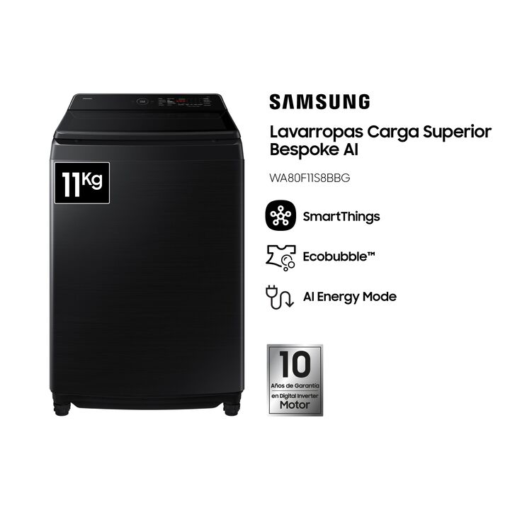 LAVARROPAS SAMSUNG WA80F11S8BBG 11KG - CARGA SUPERIOR - NEGRO Descubrí una nueva forma de lavar tu ropa con el lavarropas Samsung WA80F11S8BBG. Su diseño elegante en color Negro Caviar y su capacidad de 11 kg lo convierten en la opción ideal para familias que buscan eficiencia, tecnología y estilo. ...