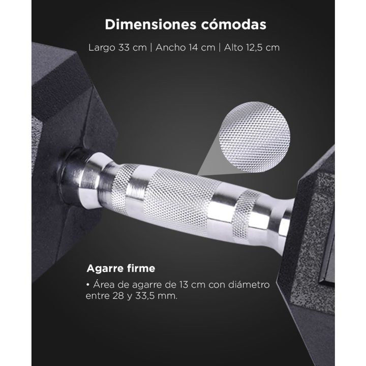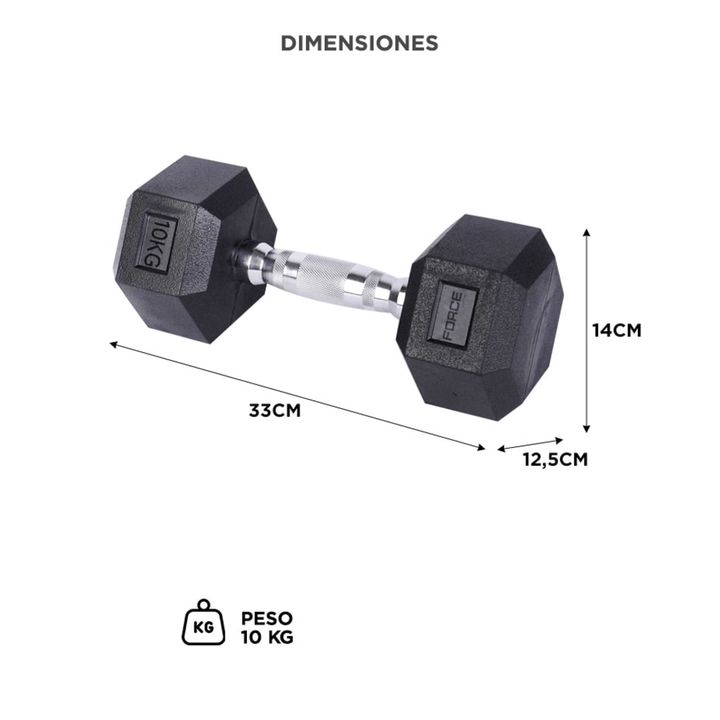 Peso intermedio: 10 kg ideales para rutinas progresivas de fuerza. Dimensiones balanceadas: 33 × 14 × 12,5 cm, fácil de manipular. Agarre ergonómico: Área de 13 cm con diámetro de 28–33,5 mm. Material resistente: Núcleo sólido con recubrimiento protector. Versátil: Perfecta para brazos, pecho y ejer...