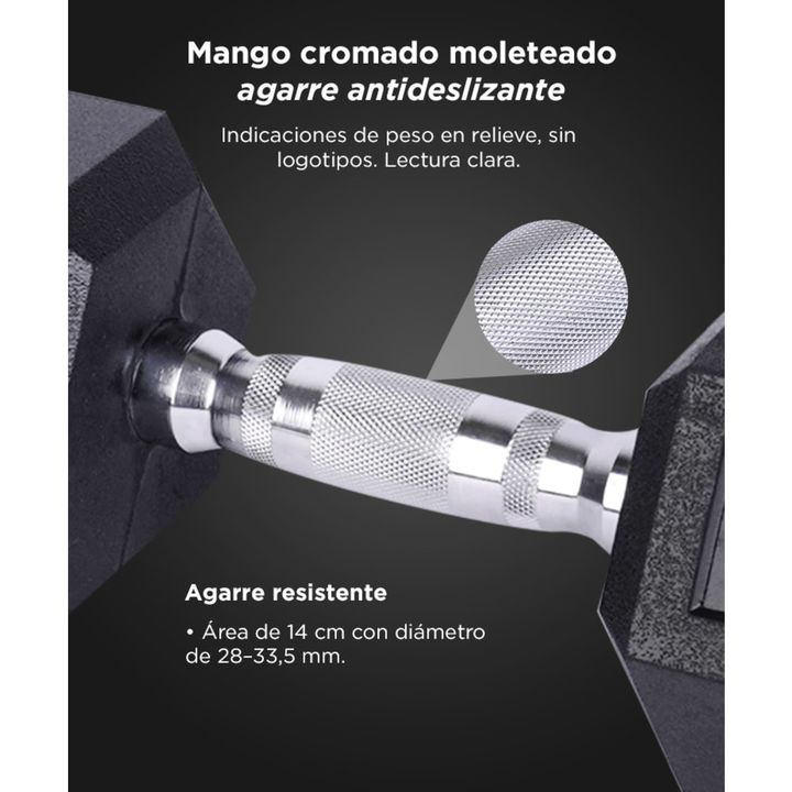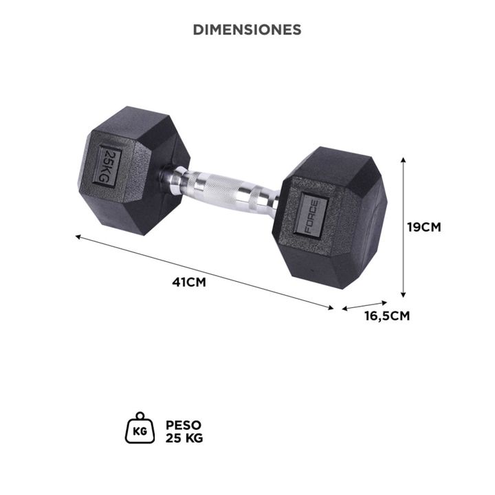 Peso desafiante: 25 kg ideales para atletas avanzados y rutinas de élite. Dimensiones grandes: 41 × 19 × 16,5 cm, ultra robusta. Agarre firme: Área de 14 cm con diámetro de 28–33,5 mm. Material premium: Núcleo sólido con recubrimiento protector. Entrenamiento avanzado: Perfecta para press, peso muer...