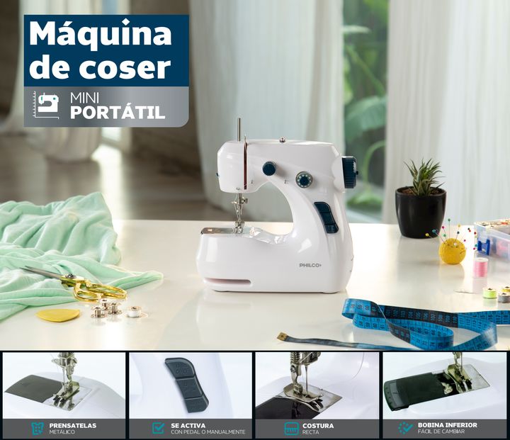 Maquina De Coser Mini Philco MCP2401 Caracteristicas: Con la máquina de coser Philco MINI, desplegá tu creatividad en tus nuevos proyectos y vas a poder realizar tus creaciones a tu gusto. Para realizar cualquier tipo de costura, cortinas, almohadones, para telas livianas, arreglo de roturas en tus ...