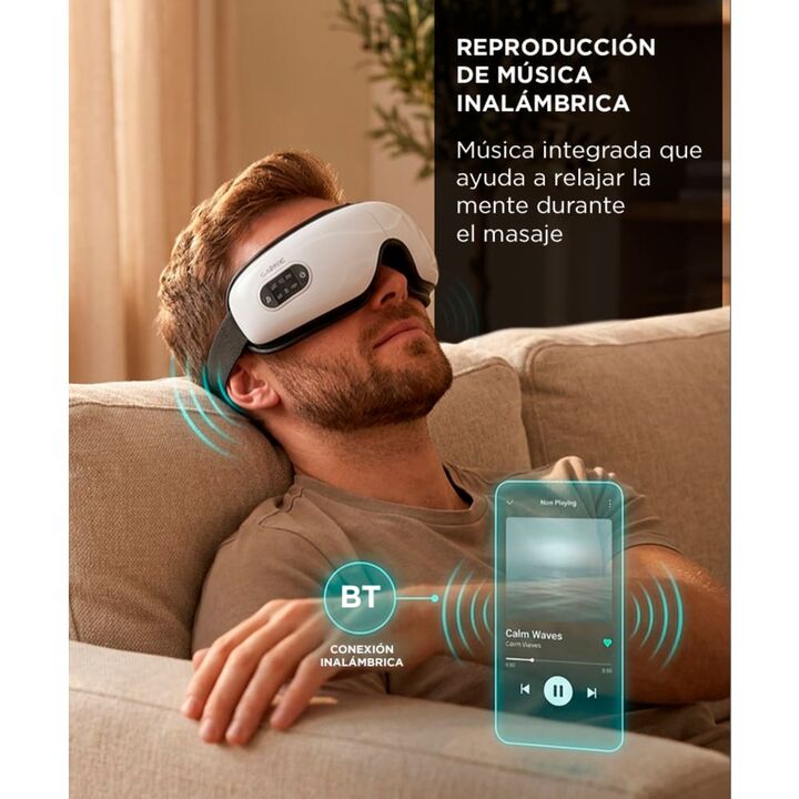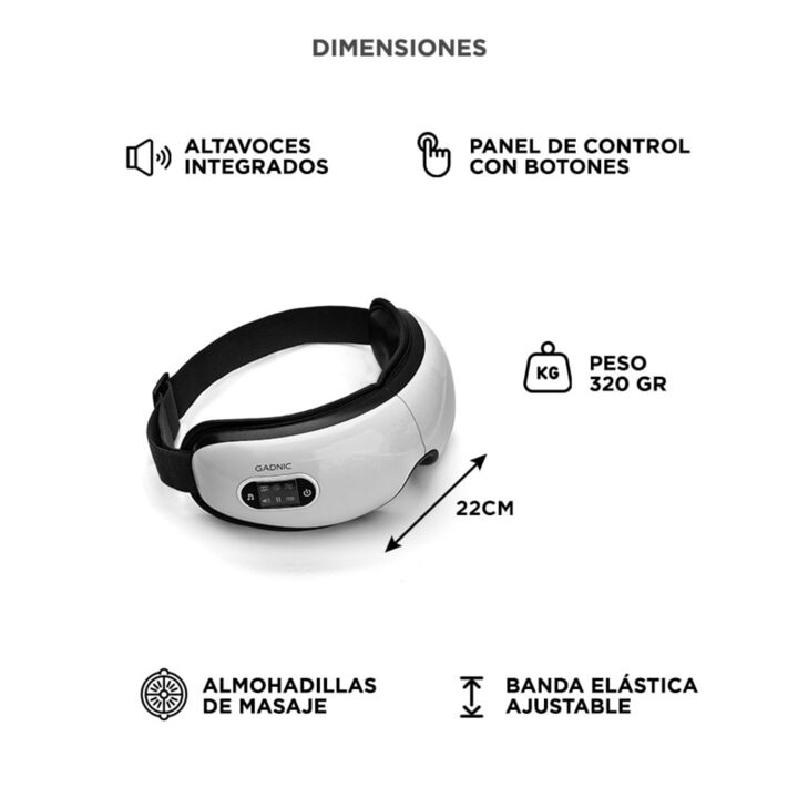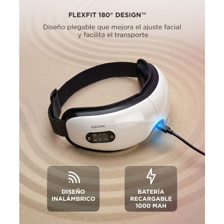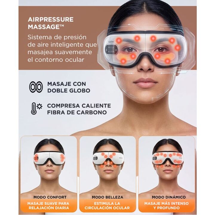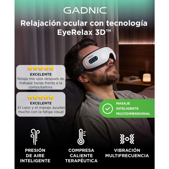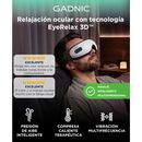 RELAX PARA LA ZONA OCULAR El masajeador de ojos Gadnic esta diseñado para brindar una experiencia de relajacion completa. Su sistema combina presion de aire vibracion y calor para aliviar la tension visual. Esto permite reducir la sensacion de fatiga ocular generada por el uso prolongado de pantalla...