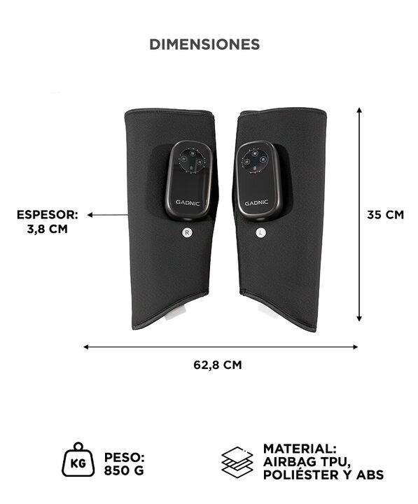 RECUPERACION INTELIGENTE PARA PIERNAS El Masajeador Gadnic MASAJ191 esta diseñado para brindar alivio focalizado en pantorrillas. Su sistema de compresión secuencial estimula la circulación y reduce la sensación de pesadez. La combinación de vibración y calor mejora la recuperación luego de activida...
