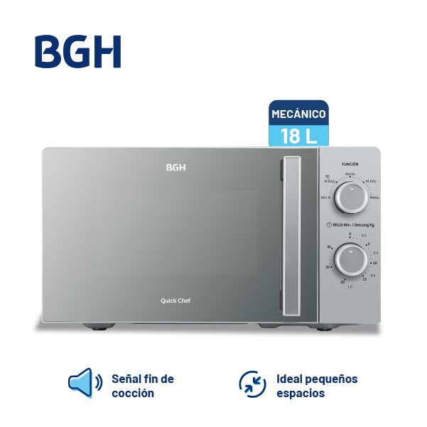 Microondas BGH Compacto Mecánico 18L Silver B118MS25 Sumá estilo y funcionalidad a tu cocina con el Microondas BGH Silver Espejado de 18L. Características principales Capacidad total: 18 litros (útil 9 litros). Potencia de salida: 700W con 5 niveles. Frente espejado con diseño moderno. Plato girator...